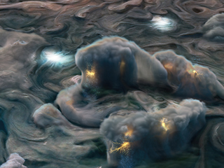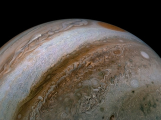 Jupiter's familiar stripes and swirls are actually cold, windy clouds of ammonia and water, floating in an atmosphere of hydrogen and helium. Jupiter’s iconic Great Red Spot is a giant storm bigger than Earth that has raged for hundreds of years.